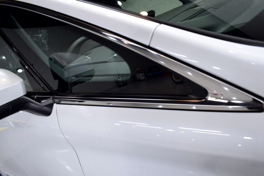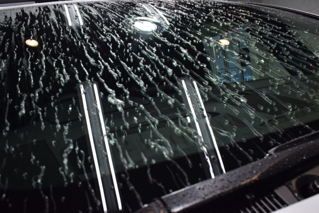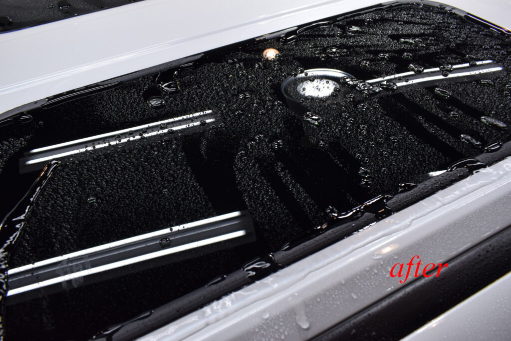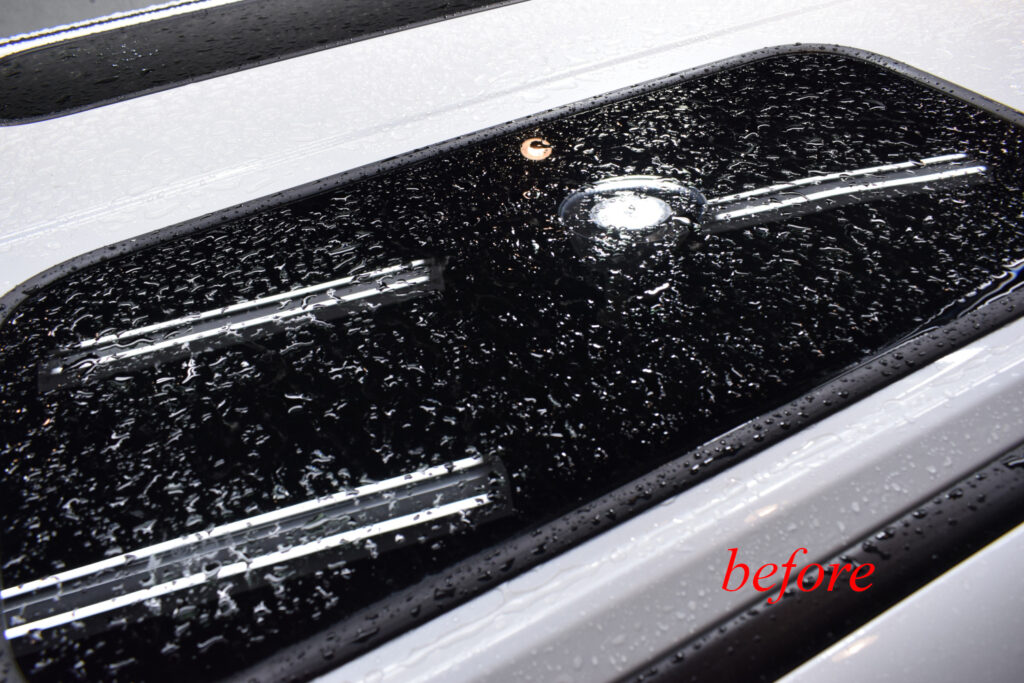 さらに、オプションメニューの窓ガラス撥水加工をご依頼いただきました。新車であってもガラス表面には油膜がびっしりと付着しています。下地処理で水ジミや油膜を除去した上で、プロ用の溶剤をたっぷり施工していきます。汚れがつきにくくなるだけでなく、雨天時の視認性が良くなりますので、安全運転につながるオススメのオプションです。
