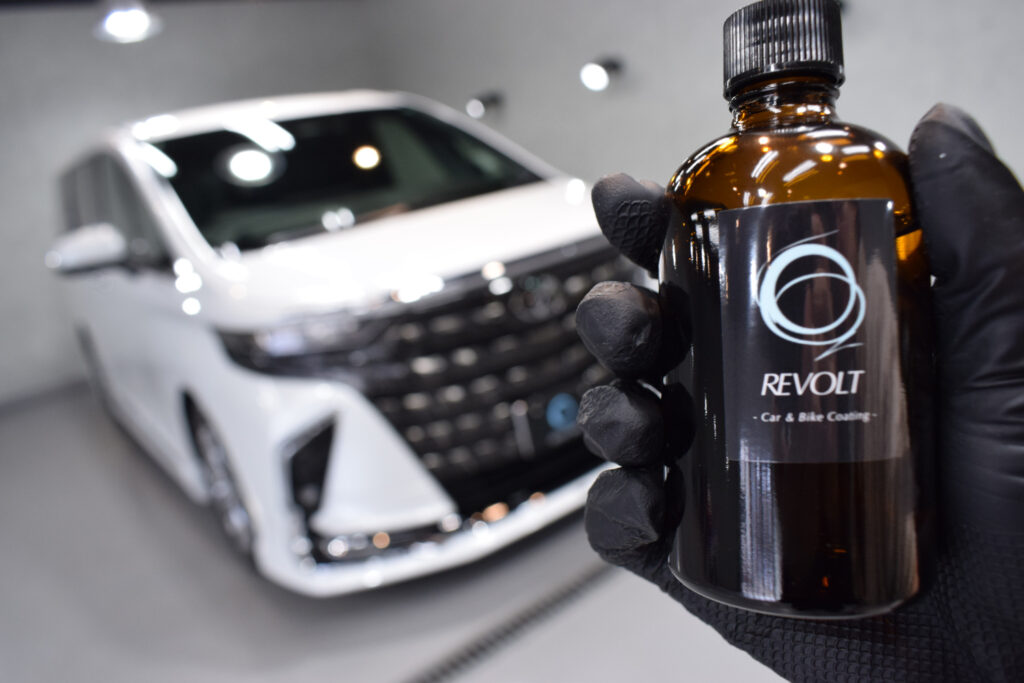 下地処理の次に行うのはコーティングです。リボルトプロは2層構造になっており、コーティング剤は当グループオリジナルの低分子・完全硬化型100%ガラス濃度のコーティング剤となっており、硬化時間の短縮、濡れたような艶、防汚効果に優れています。またトップコートには紫外線軽減(UVカット)機能が加わり紫外線からもボディを守ります。